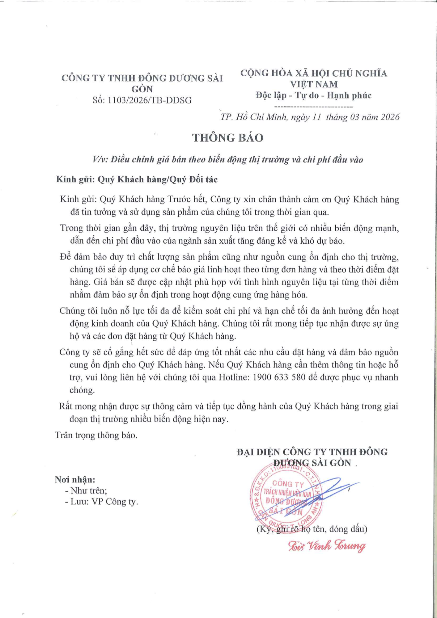 THÔNG BÁO V/v: Điều chỉnh giá bán theo biến động thị trường và chi phí đầu vào