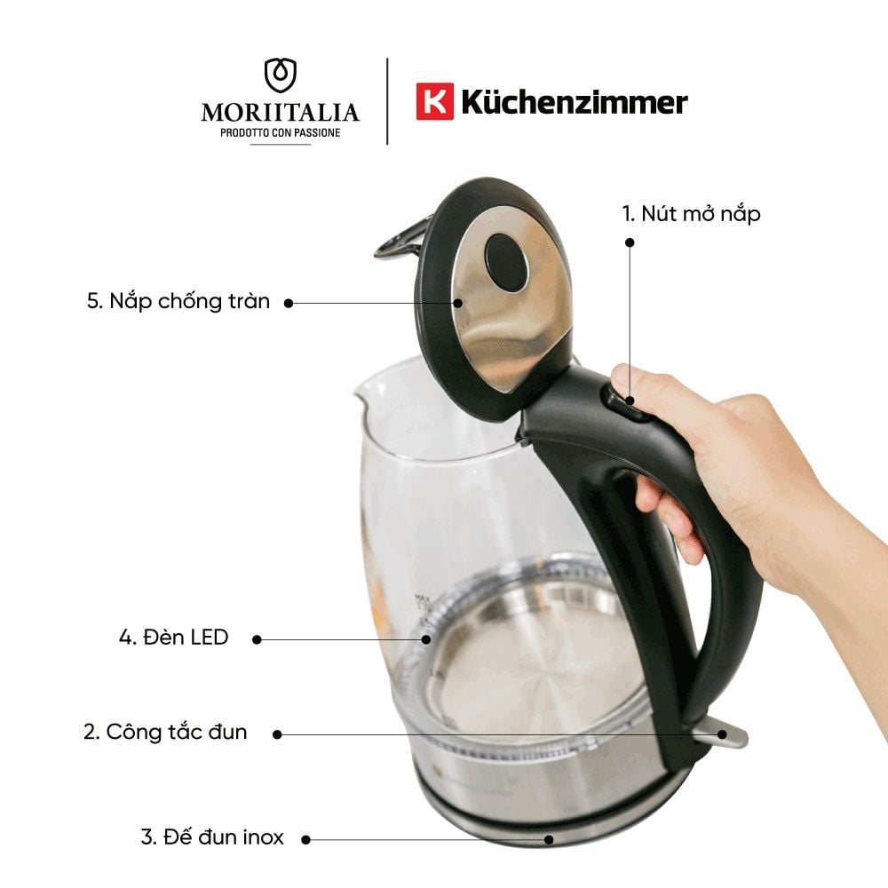 - Thiết kế: Ấm đun nước siêu tốc thủy tinh Kuchenzimmer 1.7 lít là thiết bị điện gia dụng nhà bếp cao cấp, có thiết kế lạ mắt với thân ấm làm bằng chất liệu thủy tinh trong suốt, có thể nhìn thấy được lượng nước ở bên trong ấm.