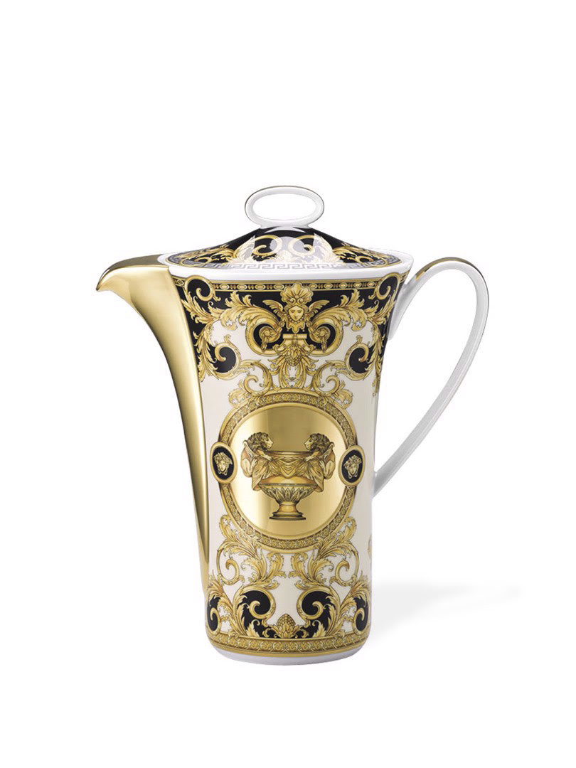 Bộ đồ ăn Versace hấp dẫn này được gọi là Prestige Gala. Nó được sản xuất bằng chất liệu sứ tốt nhất tạo ra một phong cách được mô là sang trọng và quyến rũ. Bình cà phê có dung tích 40oz hay 1180ml. Nổi bật của sản phẩm là màu của vàng. Hoạ tiết hoa trang trí làm cho sản phẩm trở nên bắt mắt trên mọi bàn ăn.