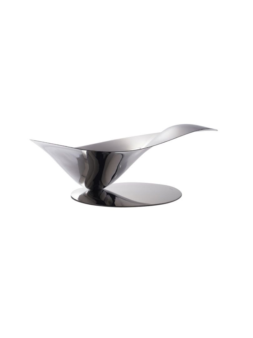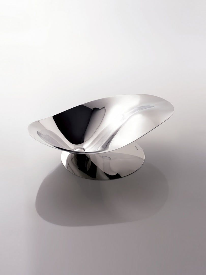 PETALO màu inox: khay đựng trái cây nằm trên một tấm thép, hình dáng tinh tế, nhạy cảm.